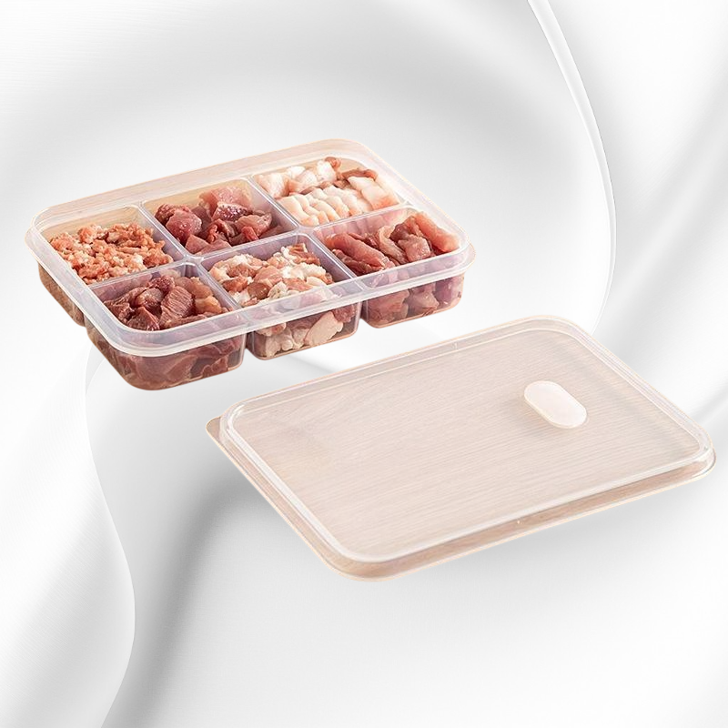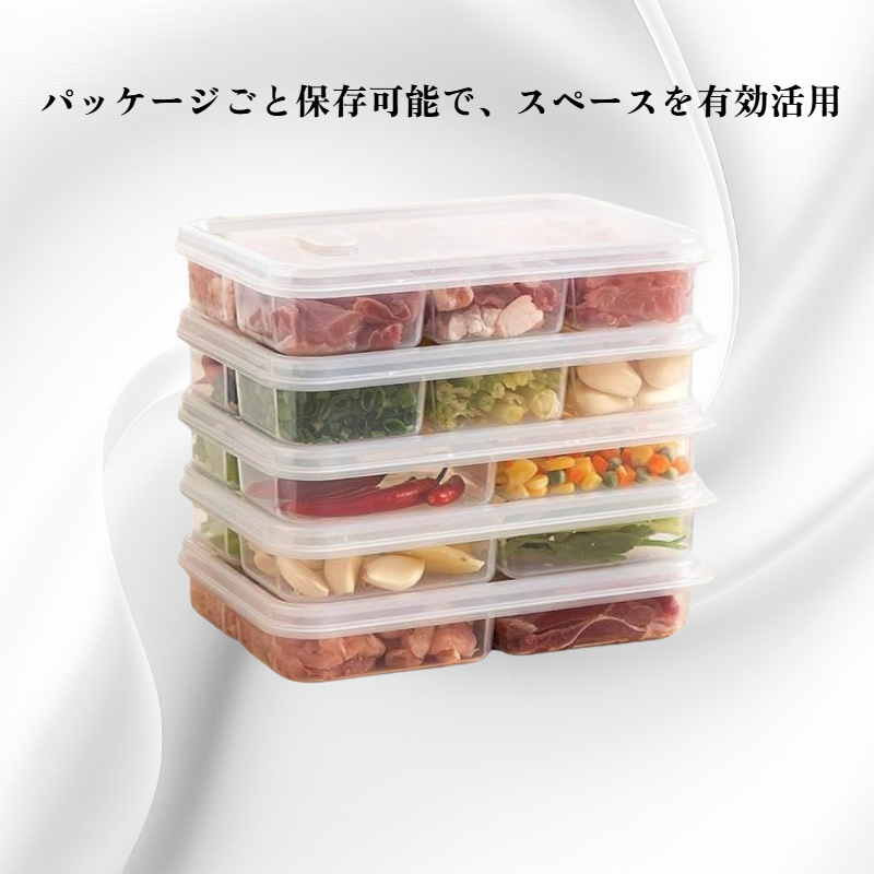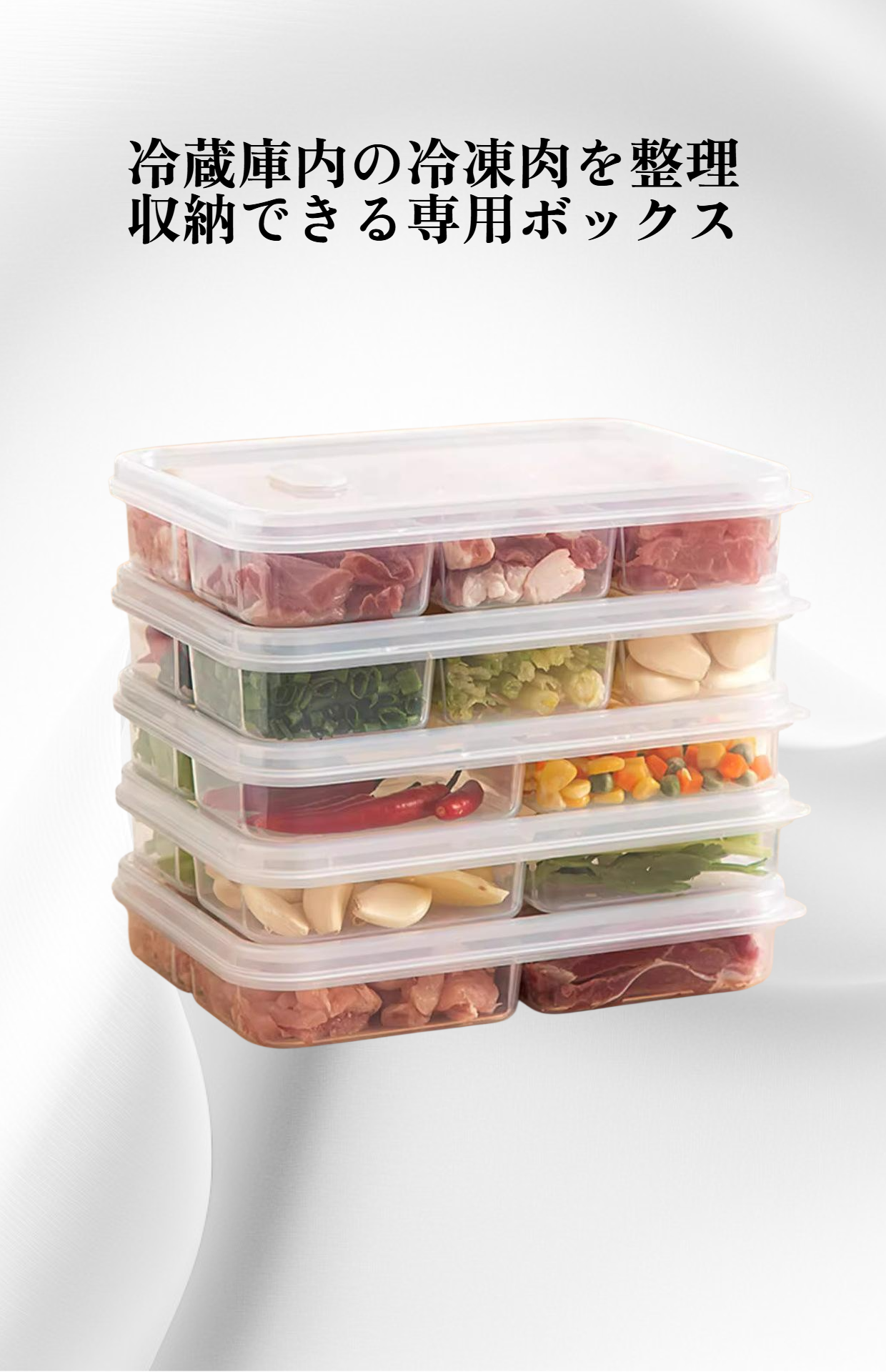 冷凍肉やパッケージ食品を整理・保存可能な収納ボックス。冷蔵庫内のスペースを有効活用し、食材の鮮度を長持ちさせる。お手入れ簡単。