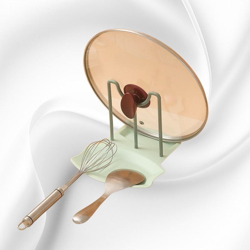 多機能鍋蓋&お玉スタンドは省スペース設計で、鍋蓋やお玉を清潔に収納可能。キッチンの整理整頓に便利な収納ラック。
